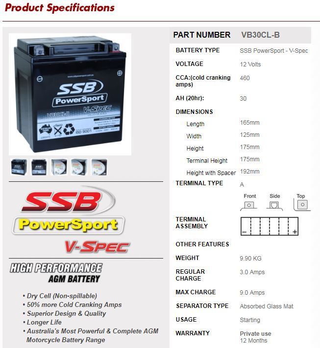 SSB Powersport V-Spec Battery (VB30CL-B)