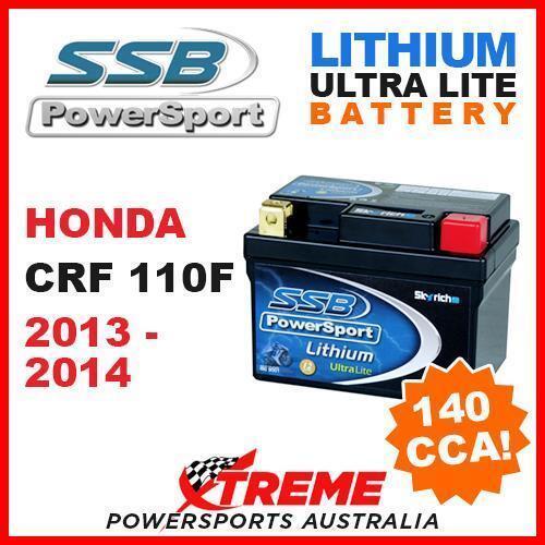 SSB 12V LITHIUM ULTRALITE 140 CCA BATTERY HONDA CRF110F CRF 110F 2013-2014 MOTO You are purchasing: SSB PowerSport Lithium Ultralite Battery (LFP5L-BS) The Lithium Ultralite range of batteries (also known as Lithium Ion Phosphate Batteries) are an extremely light weight battery designed for starting applications, and are a completely dry battery making them spill-proof and leak-proof. Suits: HONDA CRF 110F Years 2013-2014 Specifications: SSB’s lithium batteries are made using prismatic cells making them not only safe to use, but also boasts higher CCA, better cyclic properties and have a longer life. A normal lead acid battery is designed to last for 200 – 300 cycles, whereas SSB PowerSport Lithium Batteries are designed to last for over 2,000 cycles. These batteries are 100% organic, fully recyclable and pollution free, making them an excellent green energy source. To fit Honda CRF 110F 2013, 2014 models.