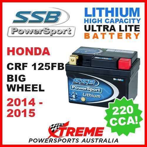SSB 12V LITHIUM ULTRALITE 240 CCA BATTERY HONDA CRF125FB BIG WHEEL 2014-2015 MX You are purchasing: SSB PowerSport Lithium Ultralite Battery High Capacity (LH5L-BS) The Lithium Ultralite range of batteries (also known as Lithium Ion Phosphate Batteries) are an extremely light weight battery designed for starting applications, and are a completely dry battery making them spill-proof and leak-proof. Suits: HONDA CRF 125FB (Big Wheel) Years 2014-2015 Specifications: SSB’s lithium batteries are made using prismatic cells making them not only safe to use, but also boasts higher CCA, better cyclic properties and have a longer life. A normal lead acid battery is designed to last for 200 – 300 cycles, whereas SSB PowerSport Lithium Batteries are designed to last for over 2,000 cycles. These batteries are 100% organic, fully recyclable and pollution free, making them an excellent green energy source. To fit Honda CRF 125FB Big Wheel 2014, 2015 models.