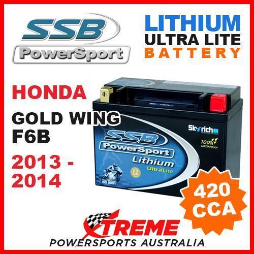 SSB 12V LITHIUM ULTRALITE 420 CCA BATTERY HONDA GOLD WING F6B 2013-2014 MOTO You are purchasing : SSB PowerSport Lithium Ultralite Battery ( LFP20HL-BS ) The Lithium Ultralite range of batteries (also known as Lithium Ion Phosphate Batteries) are an extremely light weight battery designed for starting applications, and are a completely dry battery making them spill-proof and leak-proof. Suits: HONDA Gold Wing F6B Years 2013-2014 Replaces: CB16-B, CB16C-B, CB18-A, C50N18A-A, CB16-B-CX, YTX20-BS, YTX20H-BS, HVT-5, CB16L-B, CB16L-A2, CB16CL-B, CB18L-A, CB18L-A2, C50N18L-A2, CB16HL-A-CX, C50N18L-A-CX, YTX15L-BS, YTX18L-BS, VTX20HL-BS, YTX24HL-BS, HVT-1, HVT-4, HVT-6. VTX20-BS, VTX20L-BS, VB16-B, VB16L-B, VB16CL-B, V50N18A-A, V50N18L-A2.Specifications: SSB’s lithium batteries are made using prismatic cells making them not only safe to use, but also boasts higher CCA, better cyclic properties and have a longer life. A normal lead acid battery is designed to last for 200 – 300 cycles, whereas SSB PowerSport Lithium Batteries are designed to last for over 2,000 cycles. These batteries are 100% organic, fully recyclable and pollution free, making them an excellent green energy source. To fit Honda Gold Wing F6B 2013, 2014 models.