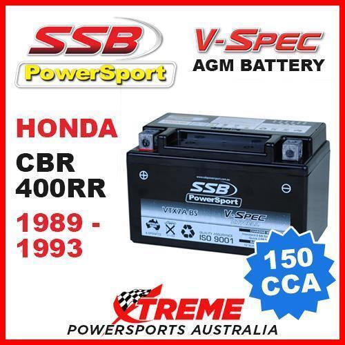SSB 12V V-SPEC DRY CELL AGM 150 CCA BATTERY HONDA CBR400RR CBR 400RR 1989-1993 You are purchasing : SSB PowerSport V-Spec AGM Battery ( VTX7A-BS ) Suits: HONDA CBR 400RR (Import NC29) Years 1989-1993 Replaces: YTX7A-BS, MBTZ10S. Specifications: V-spec batteries are completely spill and leak proof, and can be used upside down. They are manufactured using Flame Retardant ABS Plastic, making them one of the most versatile and safest motorcycle batteries in Australia. V-spec batteries are genuine VRLA (Valve Regulated Lead Acid) are manufactured to comply with Australian and International standards including Quality Assurance Standard ISO 9001. To fit Honda CBR 400RR (Import NC29) 1989, 1990, 1991, 1992, 1993 models.