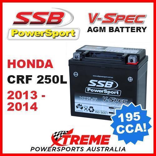 SSB 12V V-SPEC DRY CELL AGM 195 CCA BATTERY HONDA CRF250L CRF 250L 2013-2014 MX You are purchasing : SSB PowerSport V-Spec AGM Battery ( VTX5L-BS ) Suits: HONDA CRF 250L Years 2013-2014 Replaces: YTX5L-BS, YTZ7-S, GTZ7-S, YTZ7-S-BS, MBTZ7S Specifications: V-spec batteries are completely spill and leak proof, and can be used upside down. They are manufactured using Flame Retardant ABS Plastic, making them one of the most versatile and safest motorcycle batteries in Australia. V-spec batteries are genuine VRLA (Valve Regulated Lead Acid) are manufactured to comply with Australian and International standards including Quality Assurance Standard ISO 9001. To fit Honda CRF 250L 2013, 2014 models.