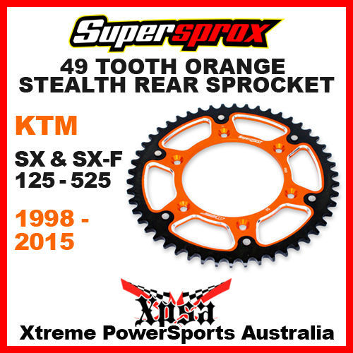 49T SUPERSPROX STEALTH SPROCKET KTM ORANGE SX SXF EXC 125 250 450 505 525 You are purchasing: Supersprox 49 T ooth Orange Stealth Rear Sprocket (11S-KTM-49OG) Suits: KTM 125 SX / 144 SX / 150 SX / 250 SX / 250 SX-F 350 SX-F / 450 SX-F / 505 SX-F / 520 SX / 525 SX Years 1998-2015 Specifications: Inner ring made from high strength Ultra-light 7075-T6 aluminium. Outer tooth ring made from electro-less Nickel-coated carbon steel. The tooth ring is pressed on the inner ring with a 200 tonne machine and 6T9 stainless steel rivets inserted, creating an indestructible forged bond. The only dual material sprocket in the world proven on 600HP street monsters.