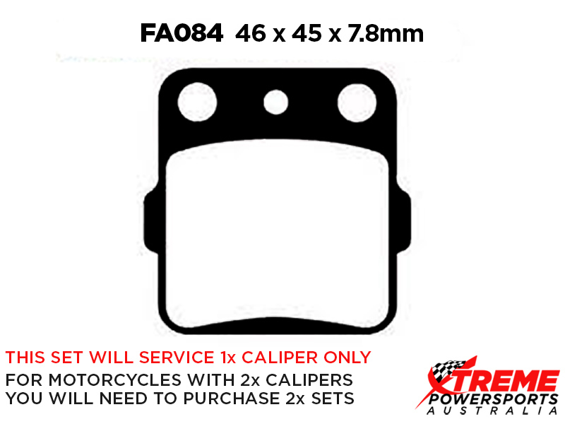 This set of brake pads will service 1x brake caliper only. For motorcycles with 2x brake calipers, you will need to purchase 2x brake pad sets.
