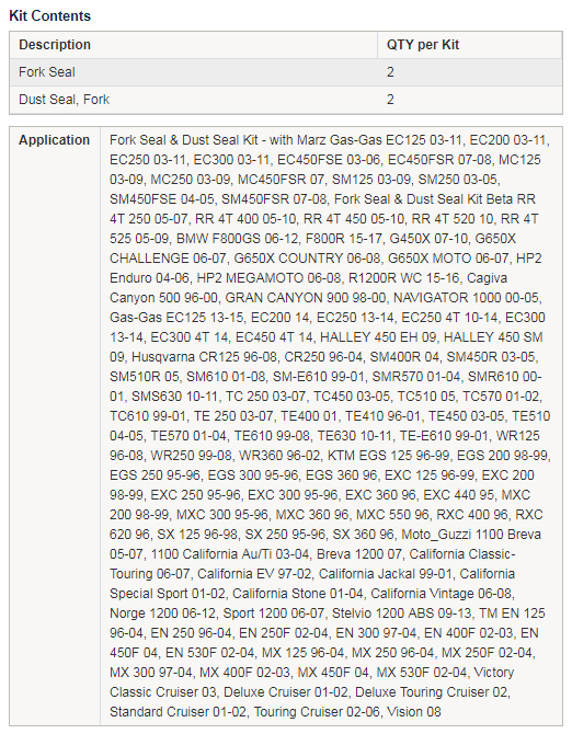 • Kit contains 2x Fork Seals and 2x Dust Seals.