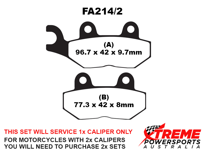 This set of brake pads will service 1x brake caliper only. For motorcycles with 2x brake calipers, you will need to purchase 2x brake pad sets.