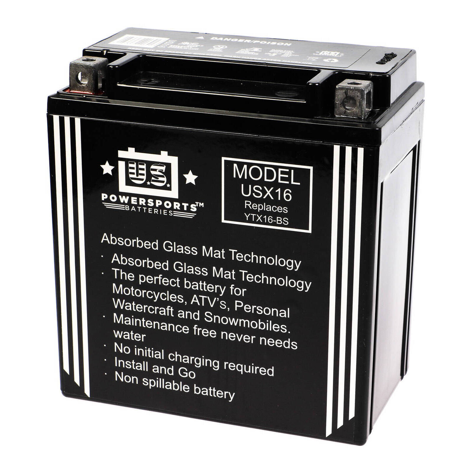 US Powersports Batteries are high-performance and specifically designed for Powersports applications. The Absorbed Glass Mat (AGM) technology creates a sealed maintenance free battery avoiding exposure to harmful acid. Due to its sealed construction the battery is also non-spillable and can be side-mounted with ease. USPS batteries are factory activated and are ready for use straight out of the box simply install and go. USPS boast a higher capacity longer discharge improved cycle life and a lower self-discharge. The perfect battery for your motorcycle ATV personal watercraft or snowmobile.