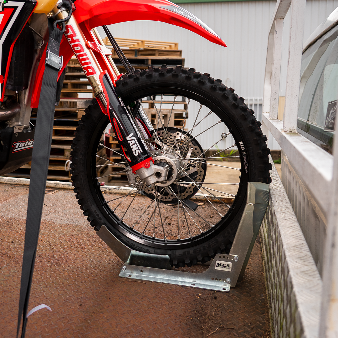 The MCS Roll On Steady Stand is a quick and easy securing option to aid in the safe transport of your bike. It can easily be mounted onto the floor of a trailer or van, and assists with keeping your machine upright when you roll your bike into the Steady Stand upon loading. This ensures it remains in an upright position to then be properly fastened in with your preferred tie-down system. The easy-adjust system is perfect when you own more than one motorbike or if you want to switch between the front and the rear tyre. The MCS Roll On Steady Stand is suitable for wheels from 10 to 19 inches and tyre widths from 90 up to 140 mm.