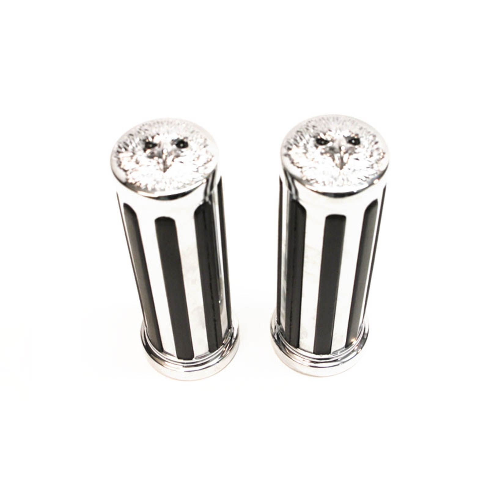 Manufactured with a chrome plated base and shell they sport the traditional "Buffalo" stripe style indents which have been inserted with raised rubber for a firm grip. The unique eagle end adds a unique look to your ride. Replaceable rubber insert ensures your grips are always providing maximum traction.