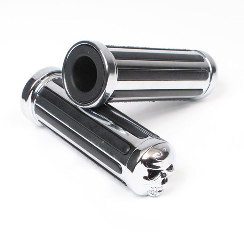 Manufactured with a chrome plated base and shell they sport the traditional "Buffalo" stripe style indents which have been inserted with raised rubber for a firm grip. The unique skull end adds a unique look to your ride. Replaceable rubber insert ensures your grips are always providing maximum traction.