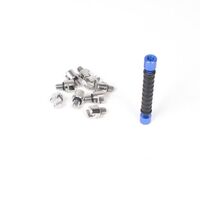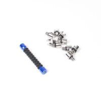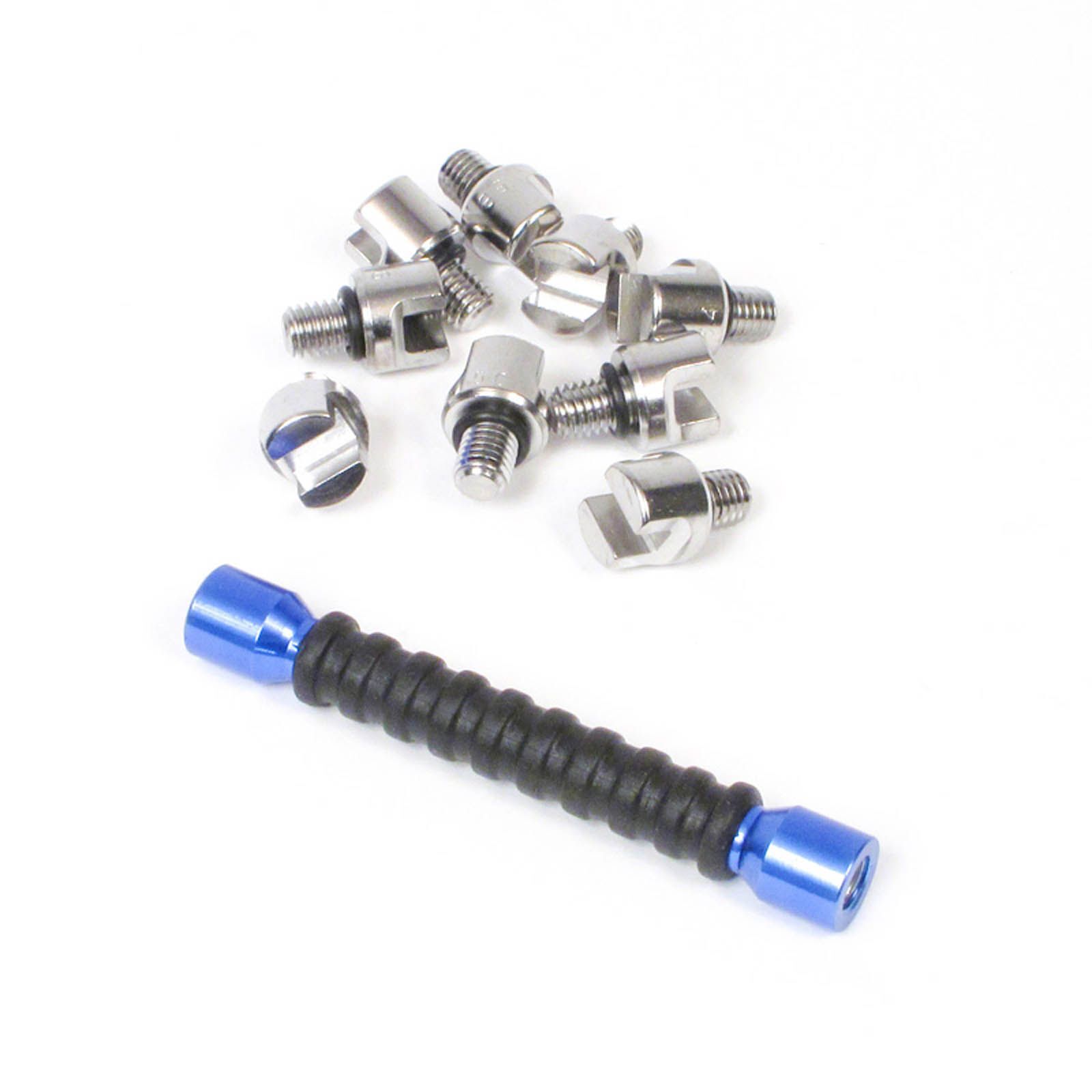 Spoke wrench with 9 screw in heads to fit a multitude of spoke sizes.
