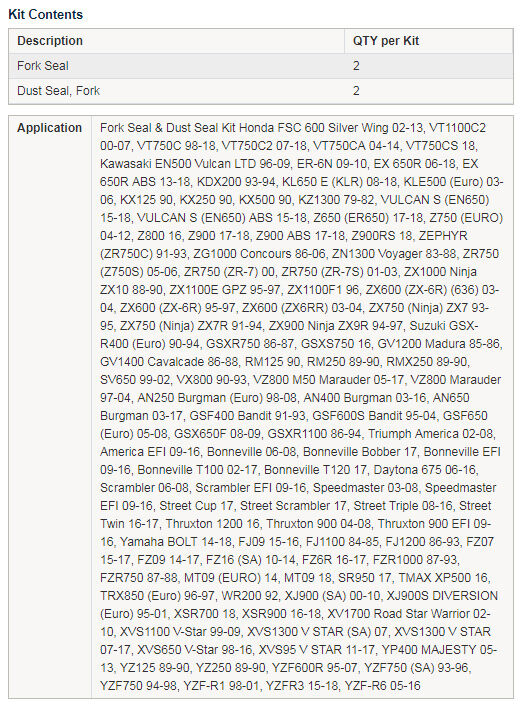 • Kit contains 2x Fork Seals and 2x Dust Seals.