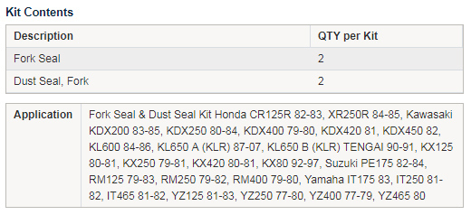 • Kit contains 2x Fork Seals and 2x Dust Seals.