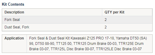• Kit contains 2x Fork Seals and 2x Dust Seals.