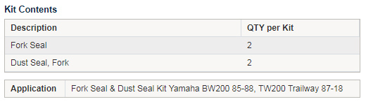 • Kit contains 2x Fork Seals and 2x Dust Seals.