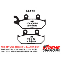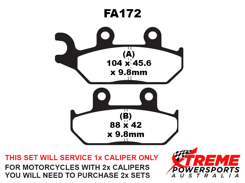 This set of brake pads will service 1x brake caliper only. For motorcycles with 2x brake calipers, you will need to purchase 2x brake pad sets.