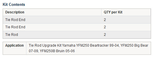 • Each kit contains two tie rods, four tie rod ends along with cotter pins and jam nuts.